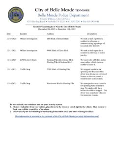 Belle Meade Incidents December 8th 2025 to December 14th 2025 Toni Tomlin | Monday, December 29th, 2025 |
