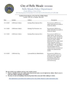 Belle Meade Incidents October 13th 2025 to October 19th 2025 Toni Tomlin | Tuesday, November 4th, 2025 |