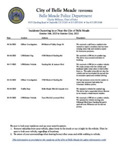 Belle Meade Incidents October 16th 2023 to October 22nd 2023 Toni Tomlin | Saturday, October 28th, 2023 |